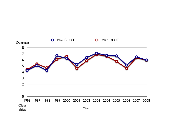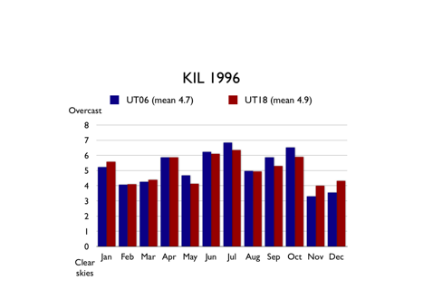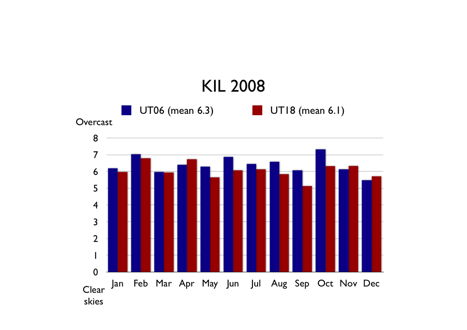 Index for total cloud cover as observed (FMI synoptic observations) at Kilpisjärvi twice a day: 06 UT and 18UT. Cloudiness varies from 0 (clear) to 8 (cloudy, when clouds cannot be observed e.g. due to fog the index is 9), and these are monthly averages. Curve plots are for the months of the optical observation season, and the histograms at the bottom are for the full years of 1996 and 2008.