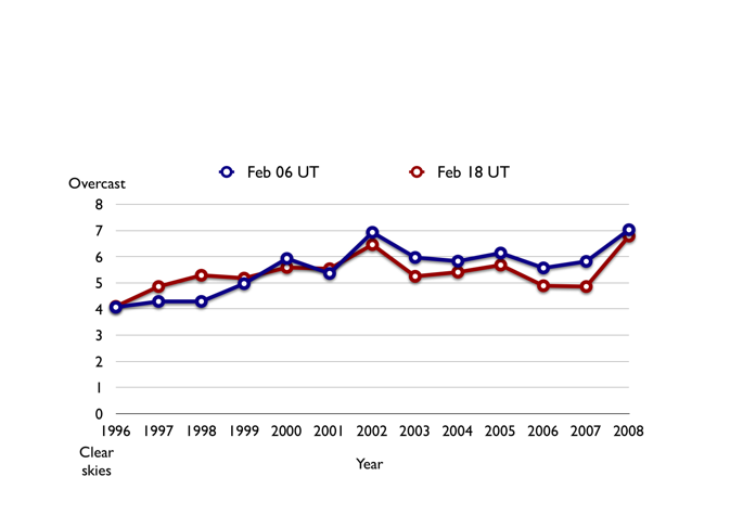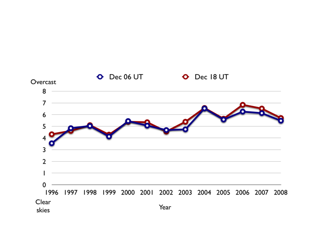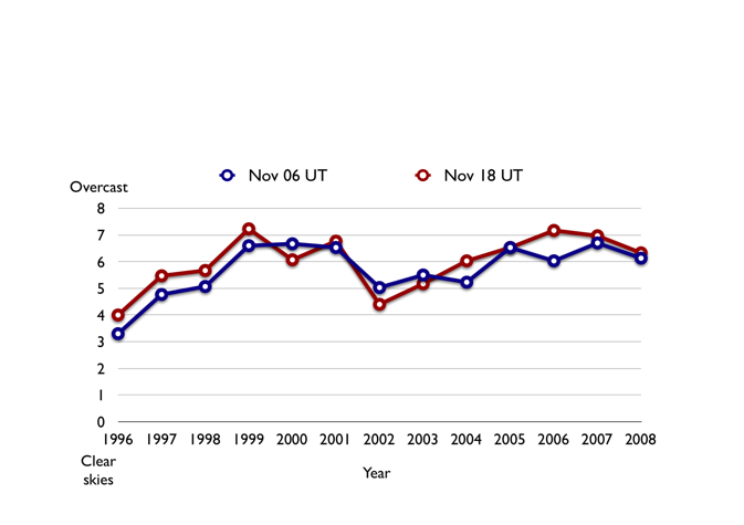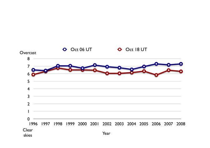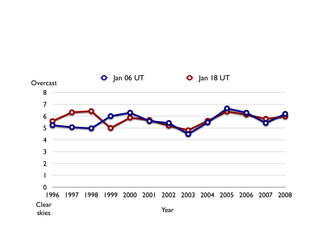 Index for total cloud cover as observed (FMI synoptic observations) at Kilpisjärvi twice a day: 06 UT and 18UT. Cloudiness varies from 0 (clear) to 8 (cloudy, when clouds cannot be observed e.g. due to fog the index is 9), and these are monthly averages. Curve plots are for the months of the optical observation season, and the histograms at the bottom are for the full years of 1996 and 2008.