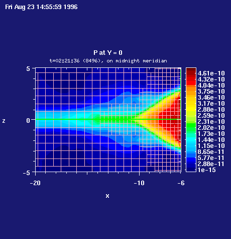 Pressure (Pa) in the Y=0 plane in the near-Earth tail at 2h 21 min (after 20 minutes of northward turning of IMF Bz).