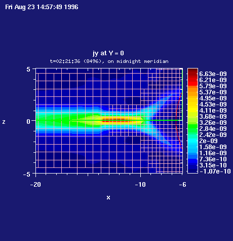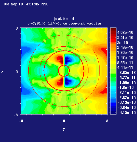 Slide 18X-directed current (jx) at X=-4 plane. Red is sunward and blue is antisunward current. The second innermost red circle has radius 3.7 R_E, which is the radius of the inner boundary of the MHD equations. The innermost circle has radius 1 R_E. On the left and right the ring current is seen; on the eveningside (right) it is positive (sunward) and on the morningside (left) it is negative (antisunward). The simulation produces the ring current at too far distance from the Eart (almost 8 R_E at equatorial plane). The smaller scale currents near the origin are part of a substorm current wedge (SCW). The total current flowing in the wedge is about 25 kA, which is rather small figure.