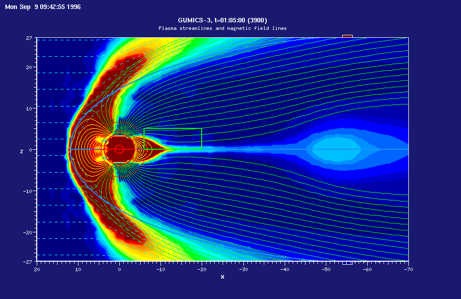 Slide 17Field lines (green, yellow), streamlines (blue) and rainbow coded pressure (limited by 0.1 nPa) in the Y=0 plane after approximately 1 hour of zero IMF. Notice the plasmoid signature in the tail at about X = -55 RE.