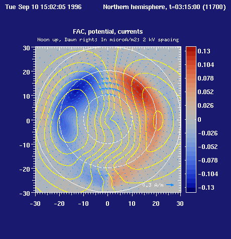 Slide 19Ionospheric situation at the time of the previous slide, where a trace of the SCW was seen in the magnetosphere. In the ionospheric plane the SCW is seen near the midnight at the lower part of the figure. A rough estimate of the total current flowing in the wedge: the current intensity at the wedge is about 0.1 uA/m2 (u=micro) and the dimensions of the wedge region are about 500 x 500 km, thus the total current is about 25 kA which agrees with the magnetospheric estimate. The Region-1 current which at this moment is enhancing from the dayside because IMF Bz has again turned southward is little bit more intense and distributed over a much wider area, thus its total magnitude is clearly larger.