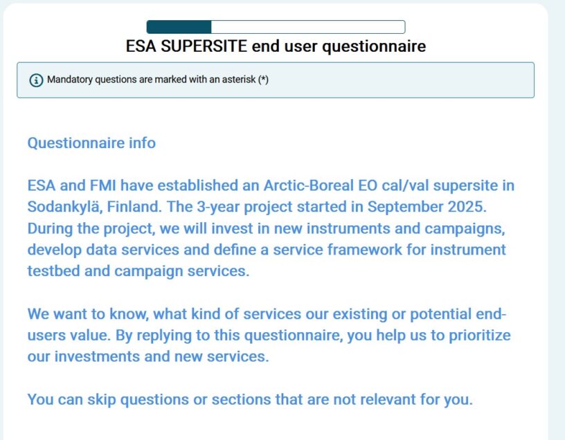 Now, we are collecting feedback from end-users about the services provided by FMI Arctic Space Centre in Sodankylä: measurements, data distribution, support for campaigns, etc. Help us to develop Sodankylä services to better match with user needs by replying to our end-user questionnaire. Your replies will impact our Supersite investment plans for years 2026-2028. Questionnaire is open until the end of January 2026.